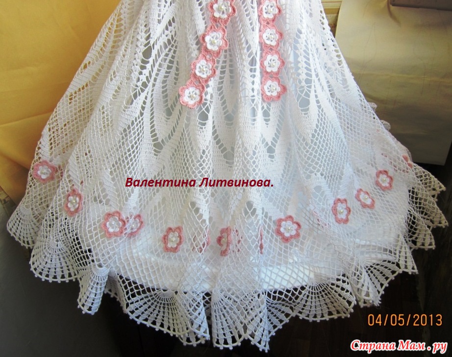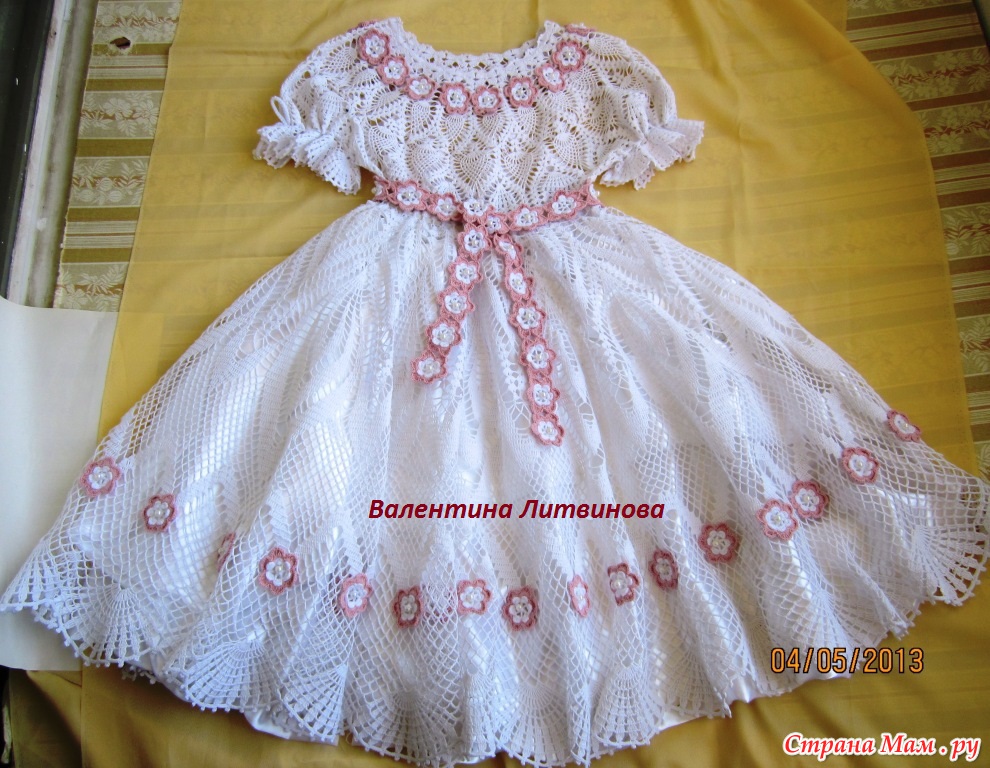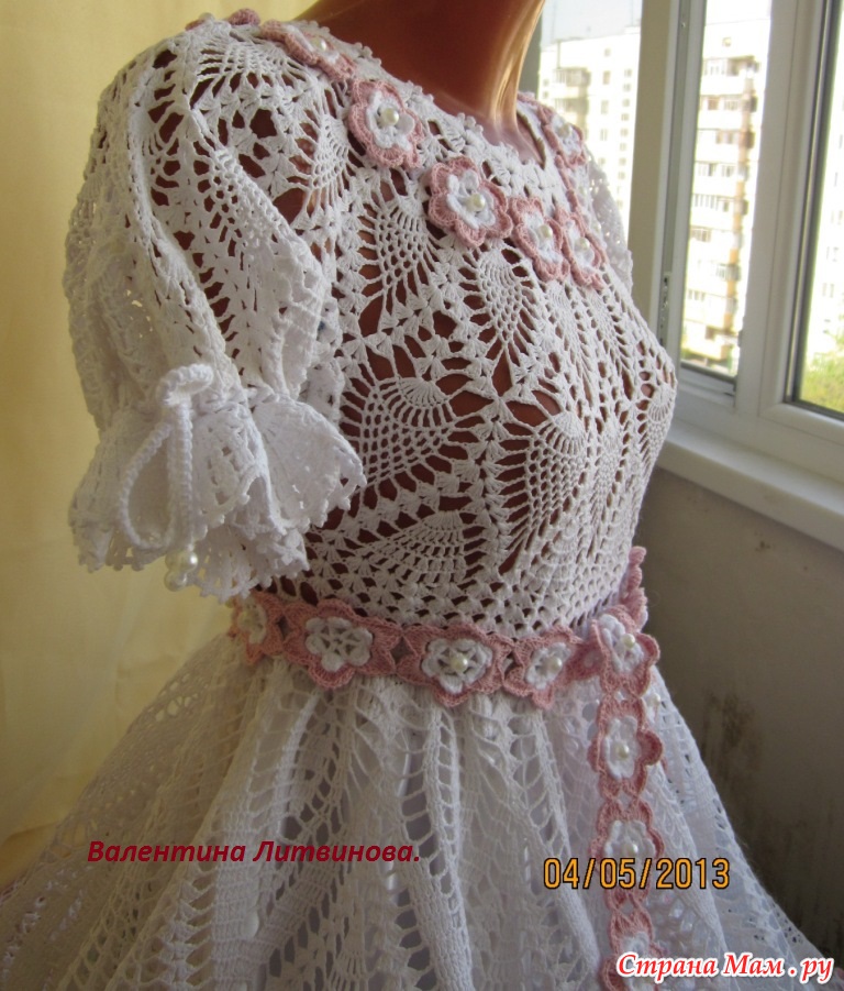 Платьице "Жемчужинка", выпускное, бальное, связано крючком для девочек 11 - 14 лет. Размер платья регулируется в талии. Юбка "Солнце". Длина юбки 60 см. Крючок №1,1. Хлопок.
