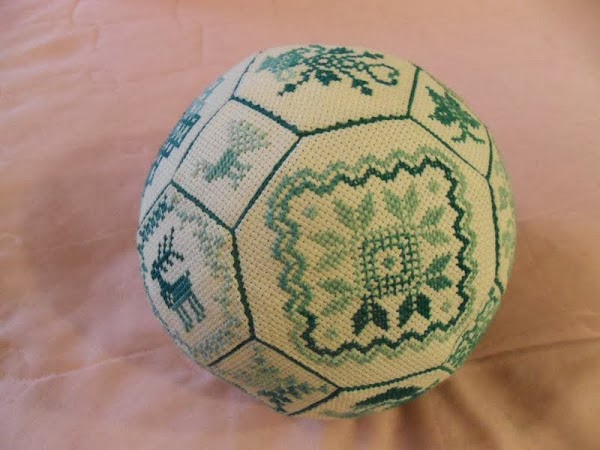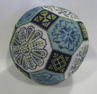 Quaker Ball  - это тряпичный мячик, выполненный в стиле Quaker Embroidery ("вышивка квакеров", об истории этой вышивки можно прочитать здесь). Идея использования мотивов старинной квакерской вышивки в таком несвойственном ей дизайне, принадлежит компании Amaryllis Artworksкоторая выпустила буклет с инструкцией по вышивке и сборке Quaker Ball трех разных размеров. Причем, мотивы у всех трех шаров совершенно одинаковые - размер варьируется только за счет изменения ткани.  Так, большой мяч вышит на льне "28-count Cashel", средний - на льне "32-count" и маленький - на льне "40-count Newcastle". Что касается ниток, то разработчики предлагают использовать шелковое мулине ручного окраса от компаний Caron Waterlilies и мулине Weeks Dye Works.