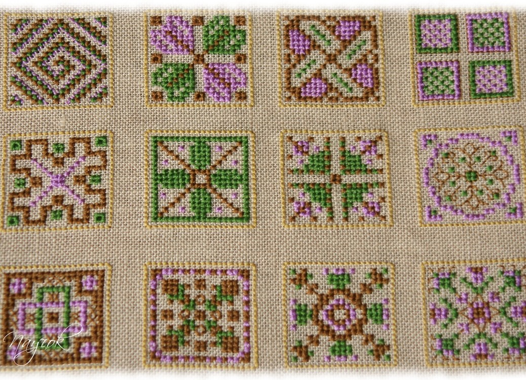 Ткань. Лен "28-count Cashel": 26 х 51 см белого цвета для восьмиугольников; 33 х 46 см темно-оливкового цвета для шестиугольников; 13 х 36 см синего цвета для квадратов.