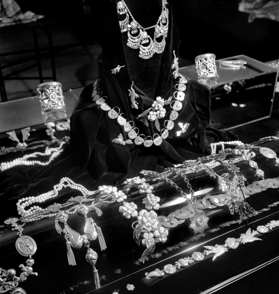 Любовь дизайнера к сдержанной одежде уравновешивалась обилием камней, искусственного жемчуга и драгоценных металлов. Массивный браслет мог заменить манжету рубашки, пояс с драгоценными камнями подчеркивал талию, правильно расположенная брошь меняла посадку платья.