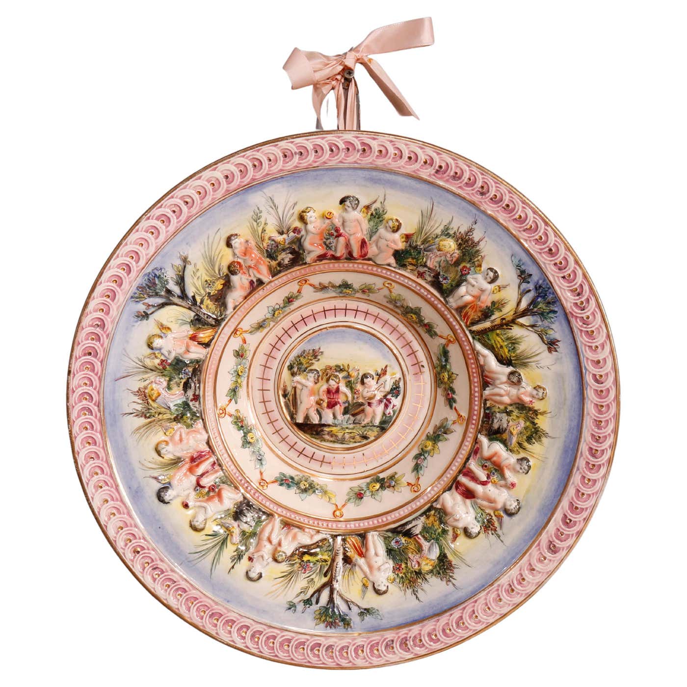 Large Italian Capodimonte Porcelain Center Bowl, Cherubs Scene in Relief, 20th C