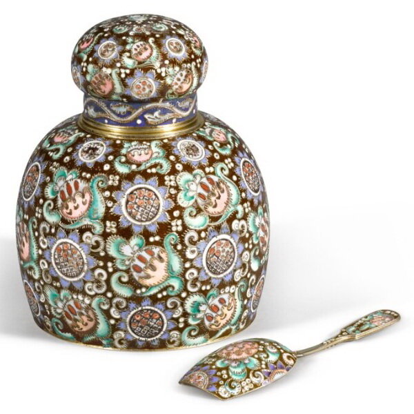 Серебряная позолоченная чайница и ложка, украшенные перегородчатой эмалью, высота 13 см, Федор Рюкерт, Москва, 1908–1917 гг.