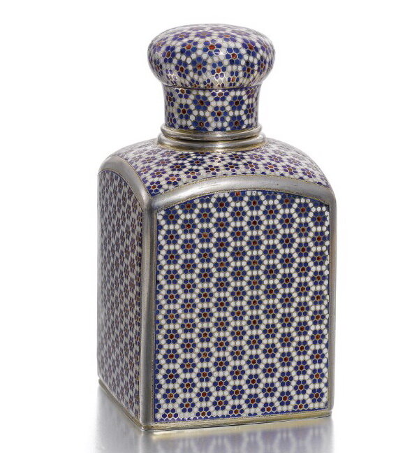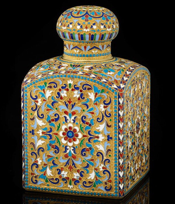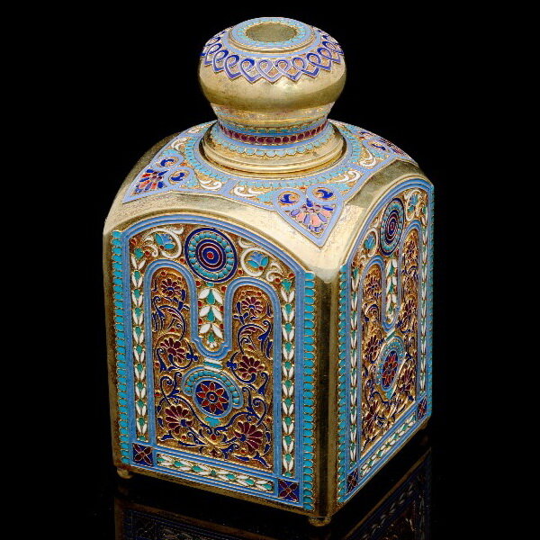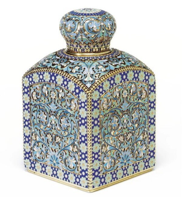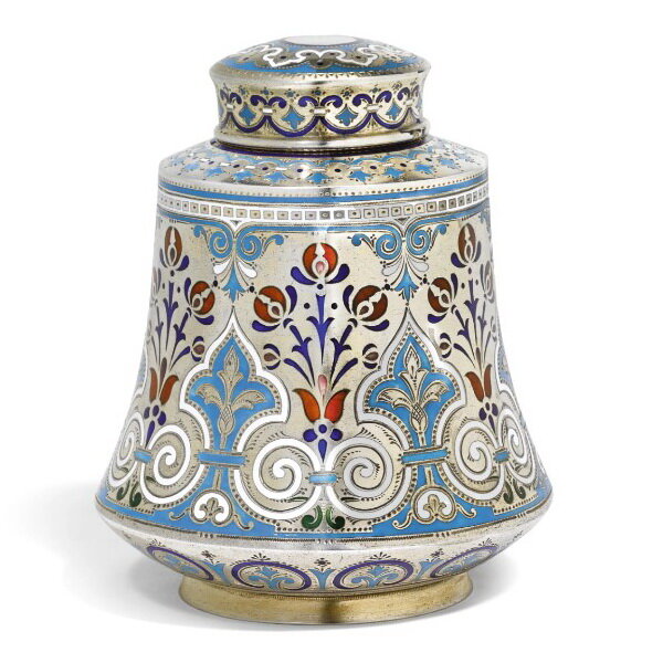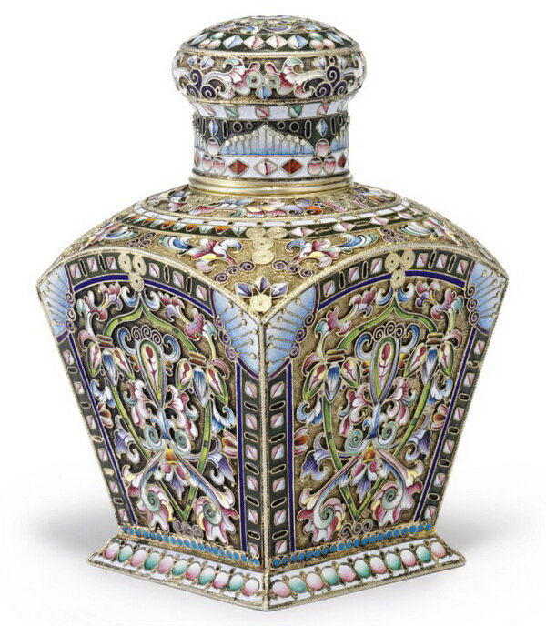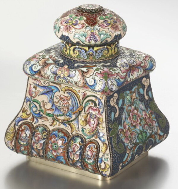 Серебряная чайница, украшенная перегородчатой эмалью и позолотой, высота 11,5 см, Антип Кузмичев для Tiffany & Co, Москва, 1892 г.