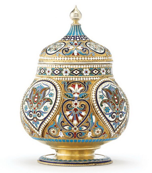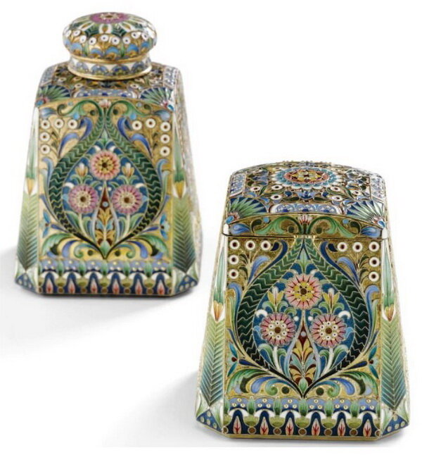 Серебряная чайница, украшенная перегородчатой эмалью и позолотой, высота 14 см, Овчинников, Москва, 1910 г.