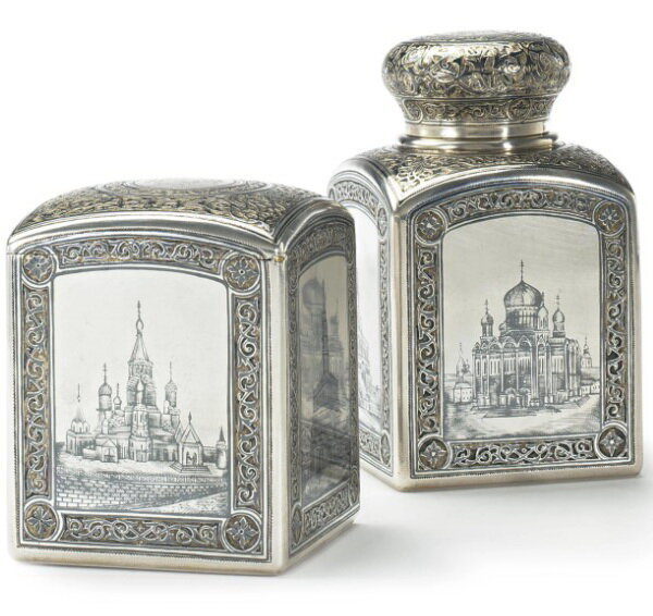 Серебряная чайница и сахарница, украшенные чернью, с изображением московских достопримечательностей, Федор Ярцев, Москва, около 1890 г.