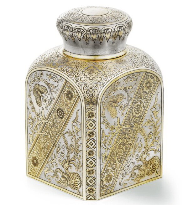 Серебряная чайница, украшенная гравированным рисунком и позолотой, высота 14 см, Павел Овчинников, Москва, 1889 г.