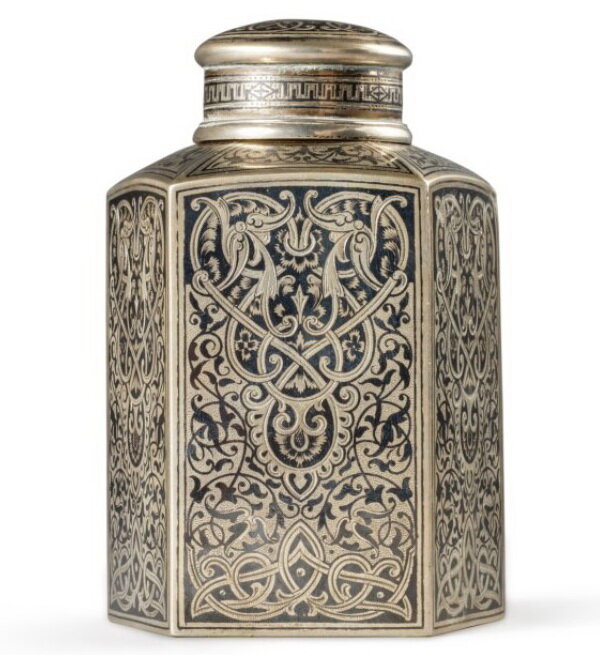Серебряная чайница, украшенная чернью, высота 11,5 см, клеймо мастера «АК», Москва, 1908-1917 гг.