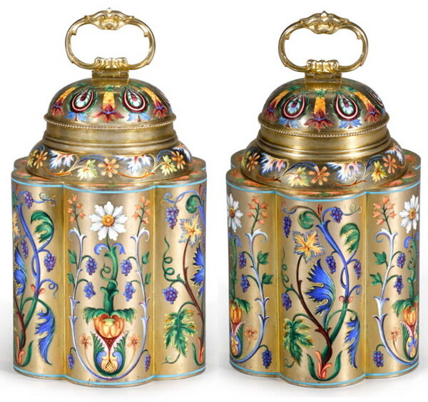 Чайница и сахарница из позолоченного серебра с эмалью, высота 12,5 см, Овчинников, Москва, 1908–1917 гг.