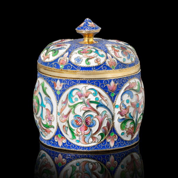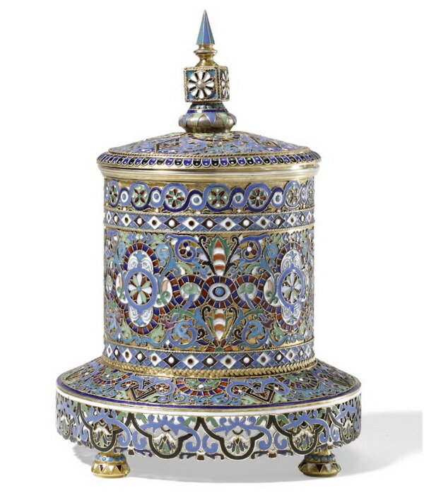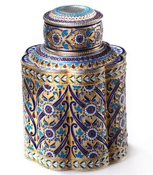 Серебряная позолоченная чайница, украшенная перегородчатой эмалью, высота 12,7 см, Федор Рюкерт, Москва, около 1900 г.