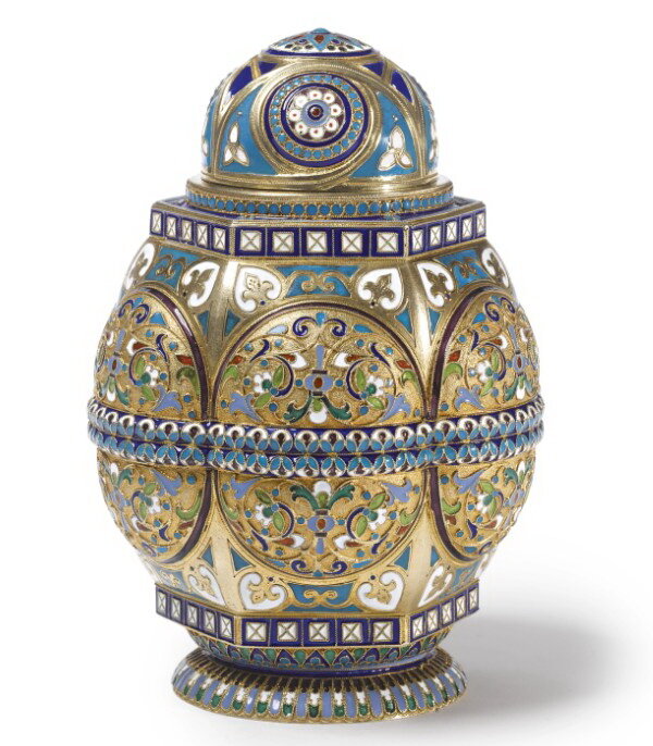 Чайница из позолоченного серебра с эмалью, высота 14 см, Овчинников, Москва, около 1900 г.