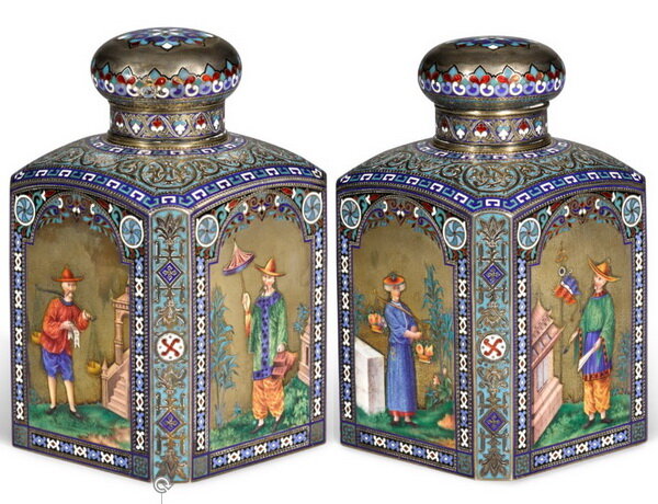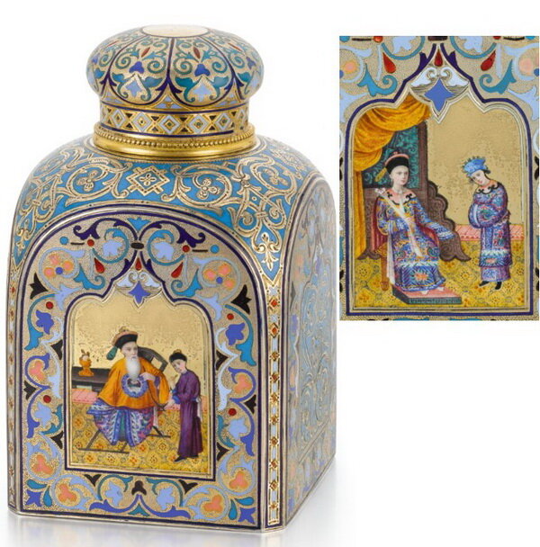 Серебряная чайница в стиле шинуазри, украшенная выемчатой и живописной эмалью и позолотой, высота 13 см, Овчинников, Москва, 1884 г.