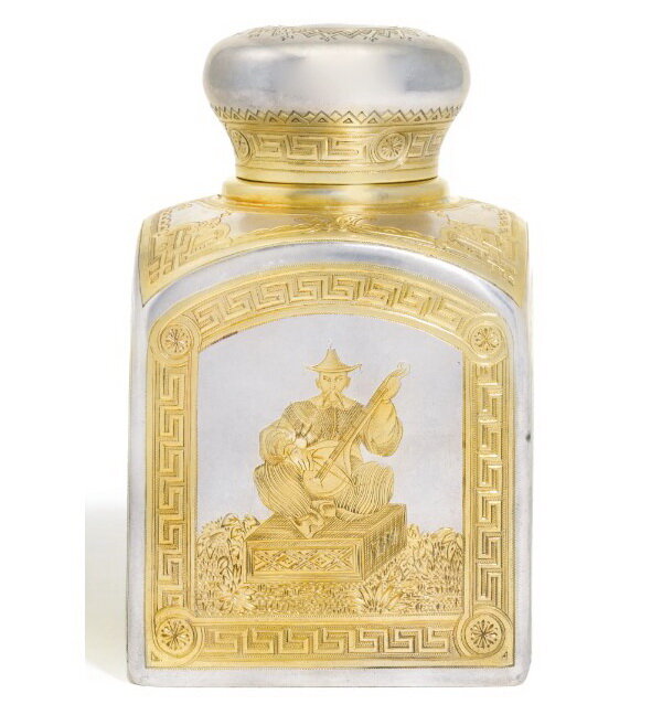 Чайница в стиле шинуазри из серебра с позолотой, высота 14 см, Федор Ярцев, Москва, 1889 г.