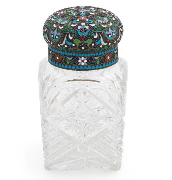 Чайница из хрустального стекла с серебряной крышкой, украшенной перегородчатой эмалью, Москва, 1908 - 1927 гг.