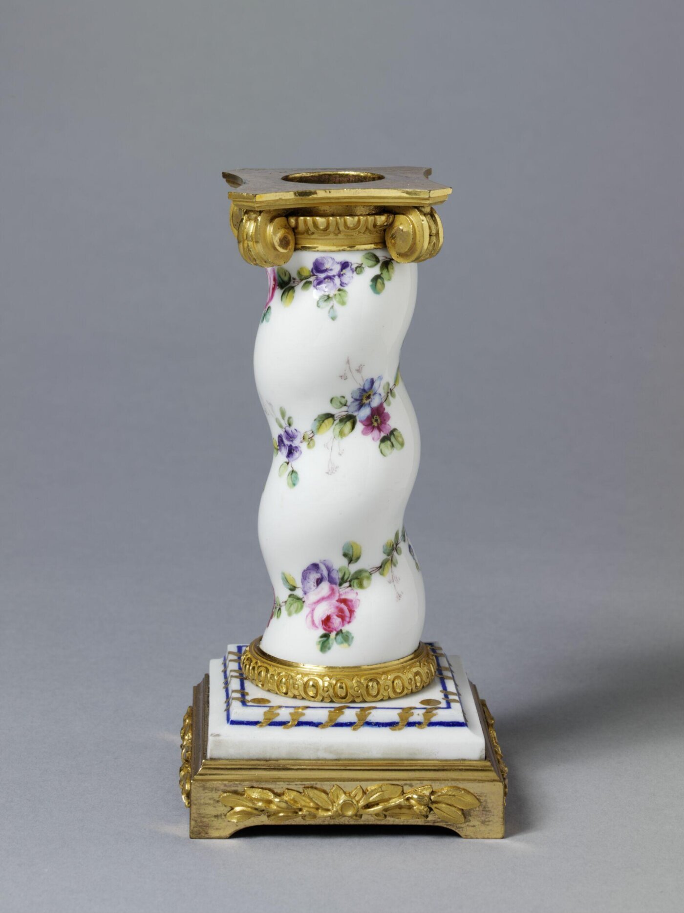 Paire de flambeaux en porcelaine de Paris et bronze doré d'époque Louis XVI, vers 1780-1785