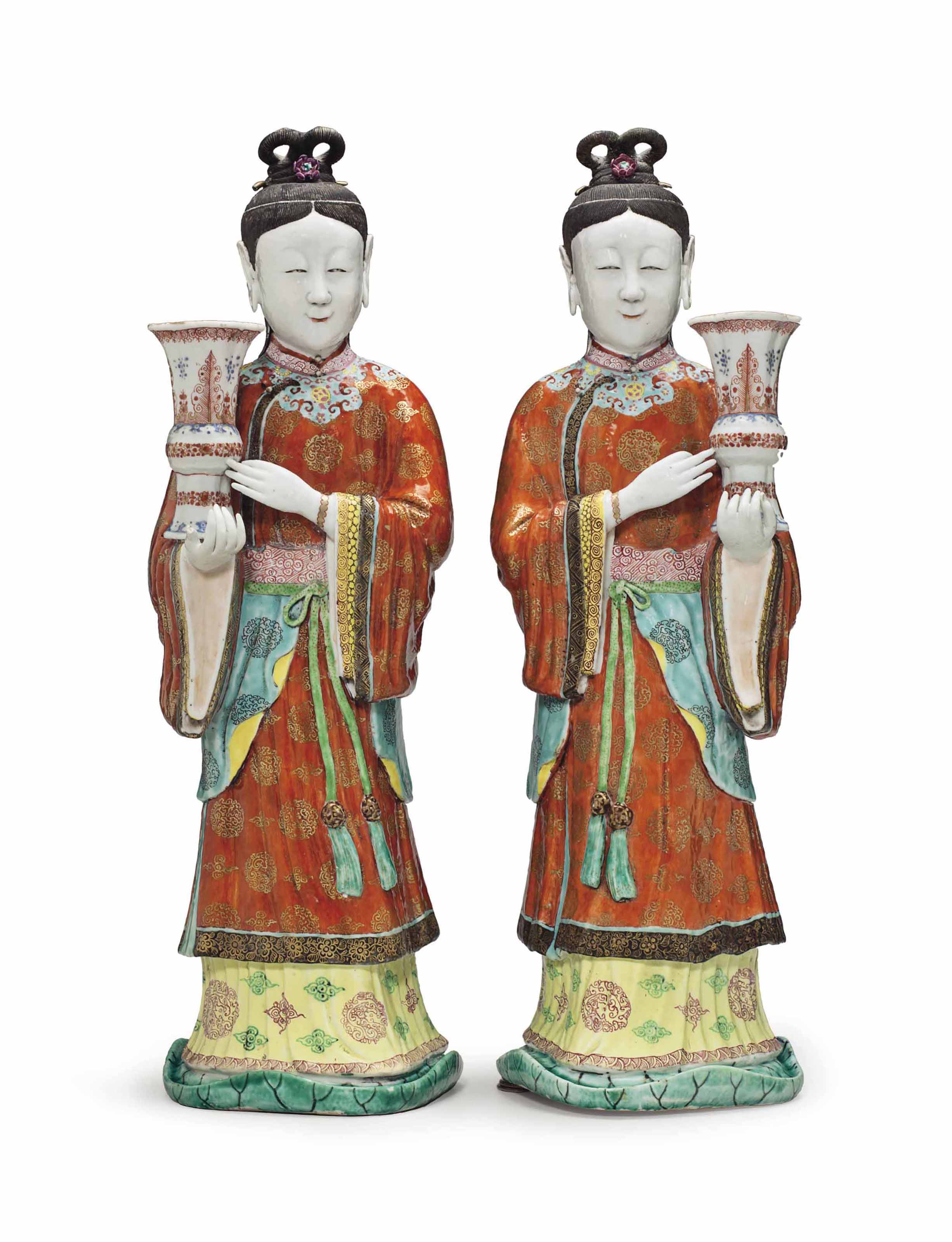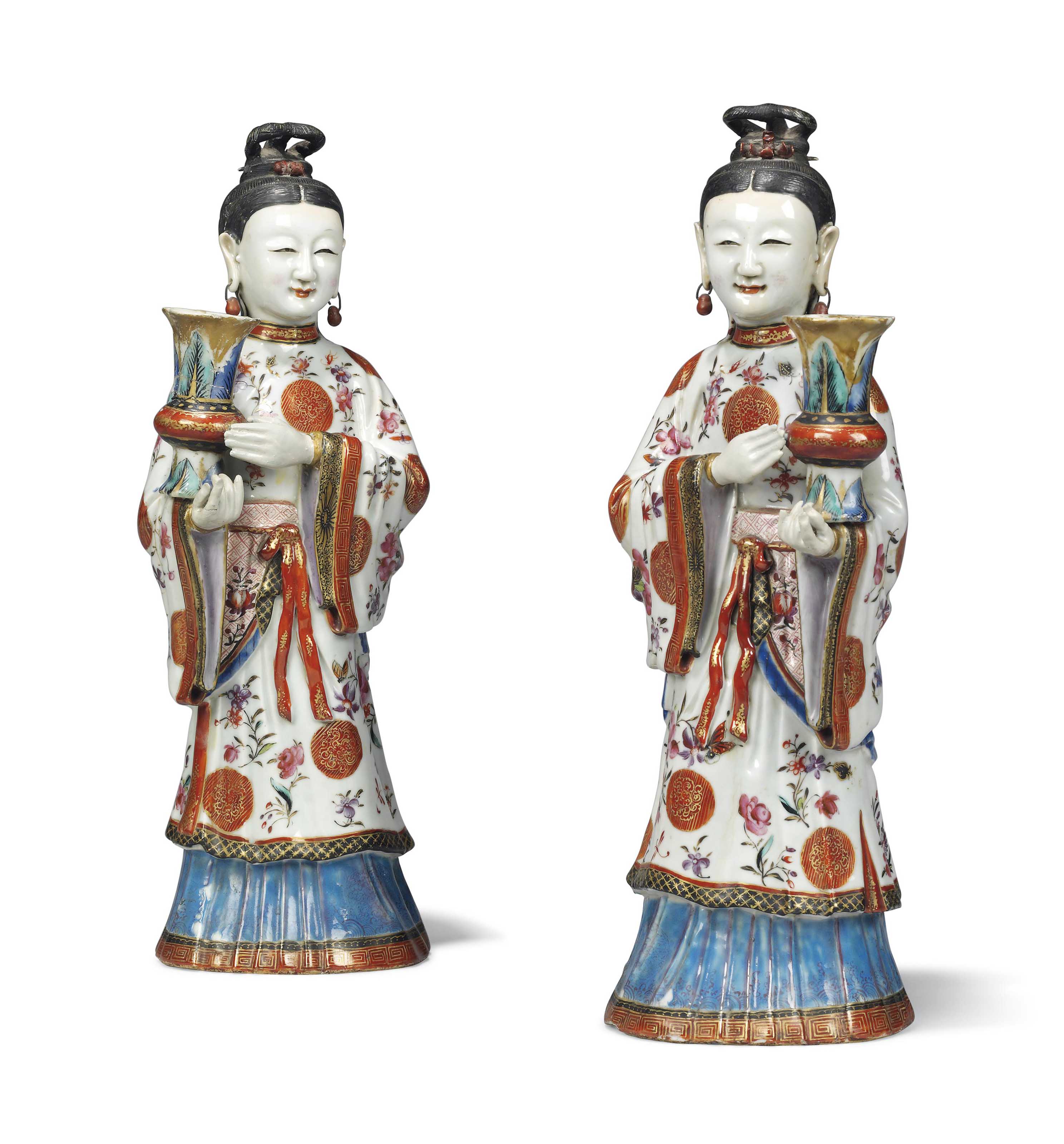 A LARGE PAIR OF FAMILLE ROSE COURT LADY CANDLEHOLDERS , 18TH CENTURY