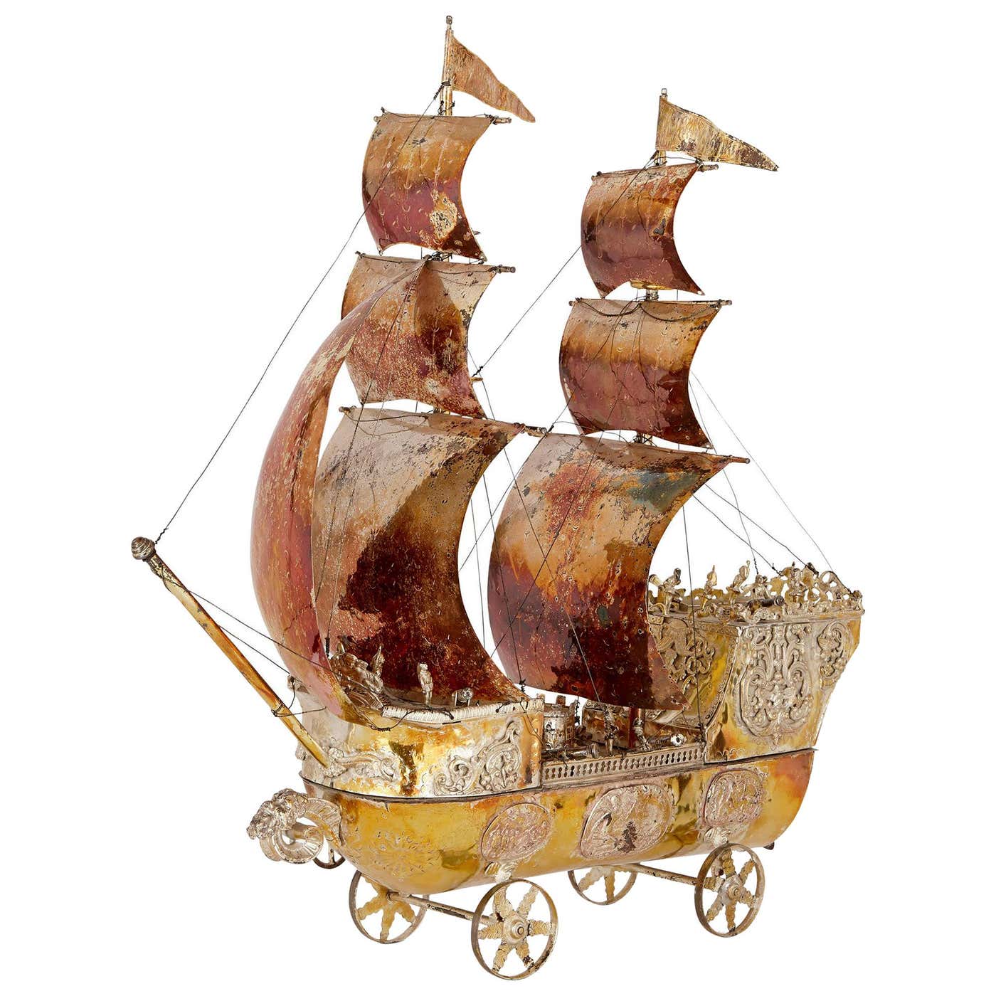 LARGE ANTIQUE REPOUSSÉ SILVERED NEF IN THE FORM OF A GALLEON