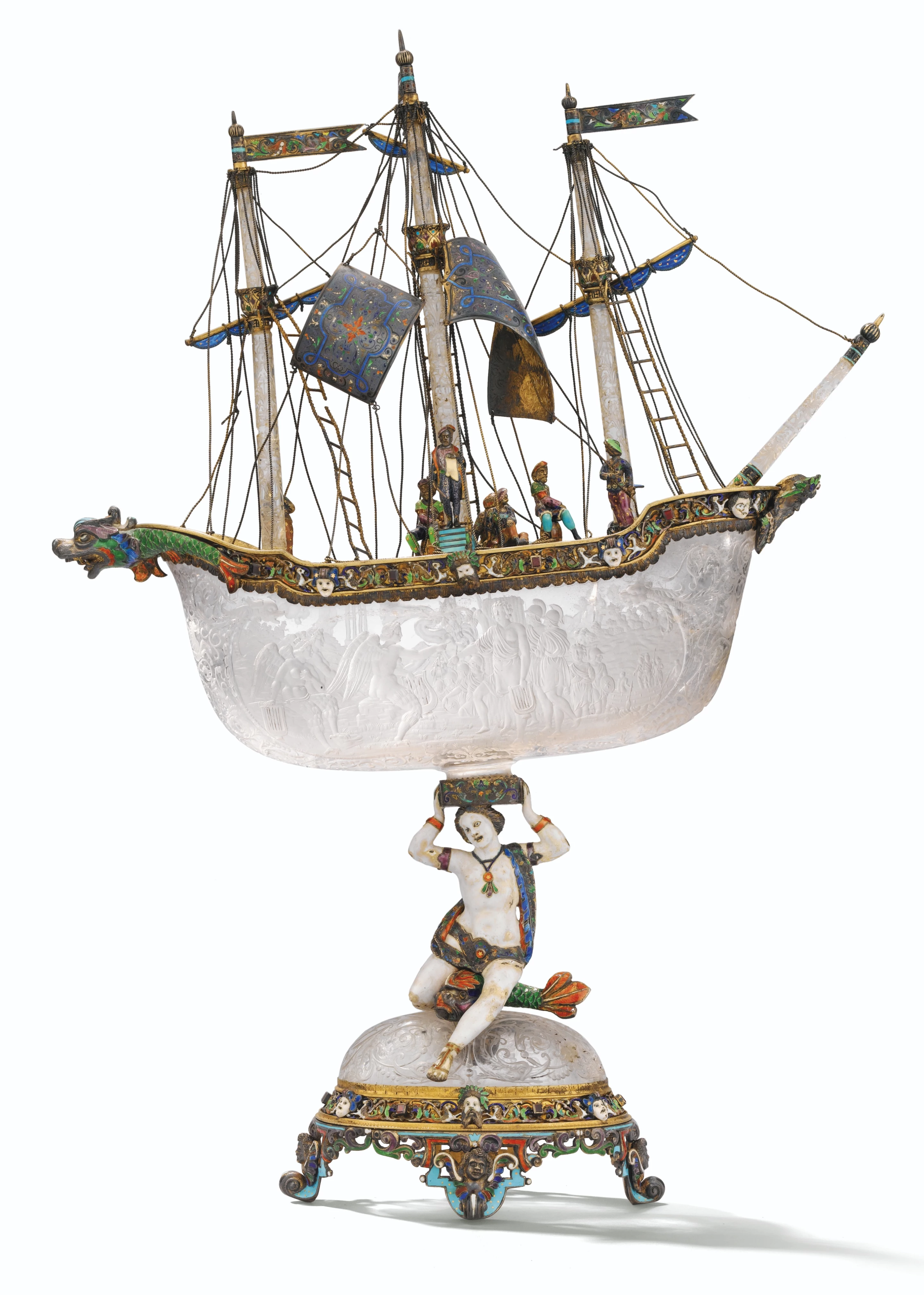 An Austrian rock crystal, enamel and silver-gilt nef, maker's mark SG probably for Simon Grünwald, Vienna, circa 1880