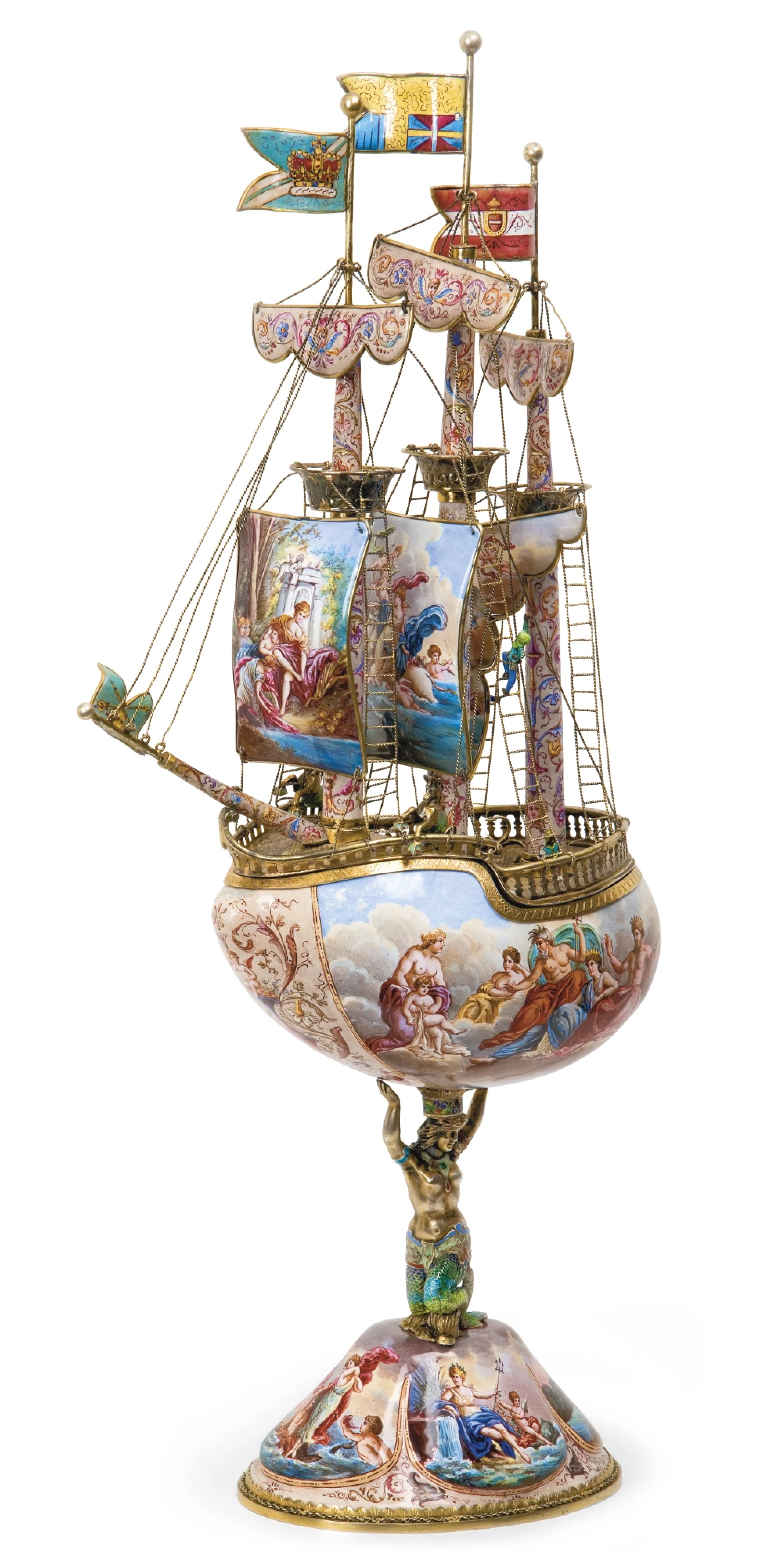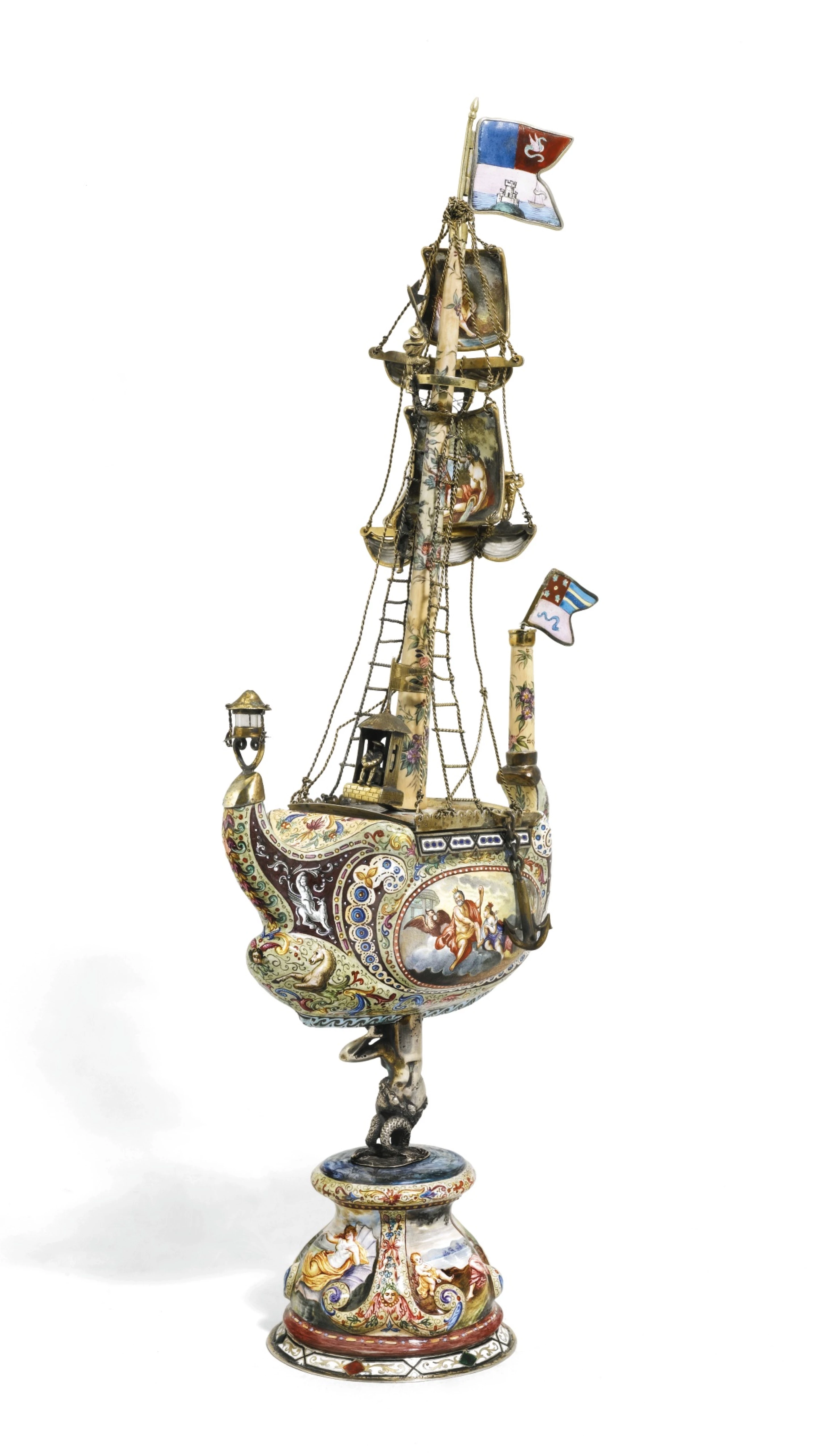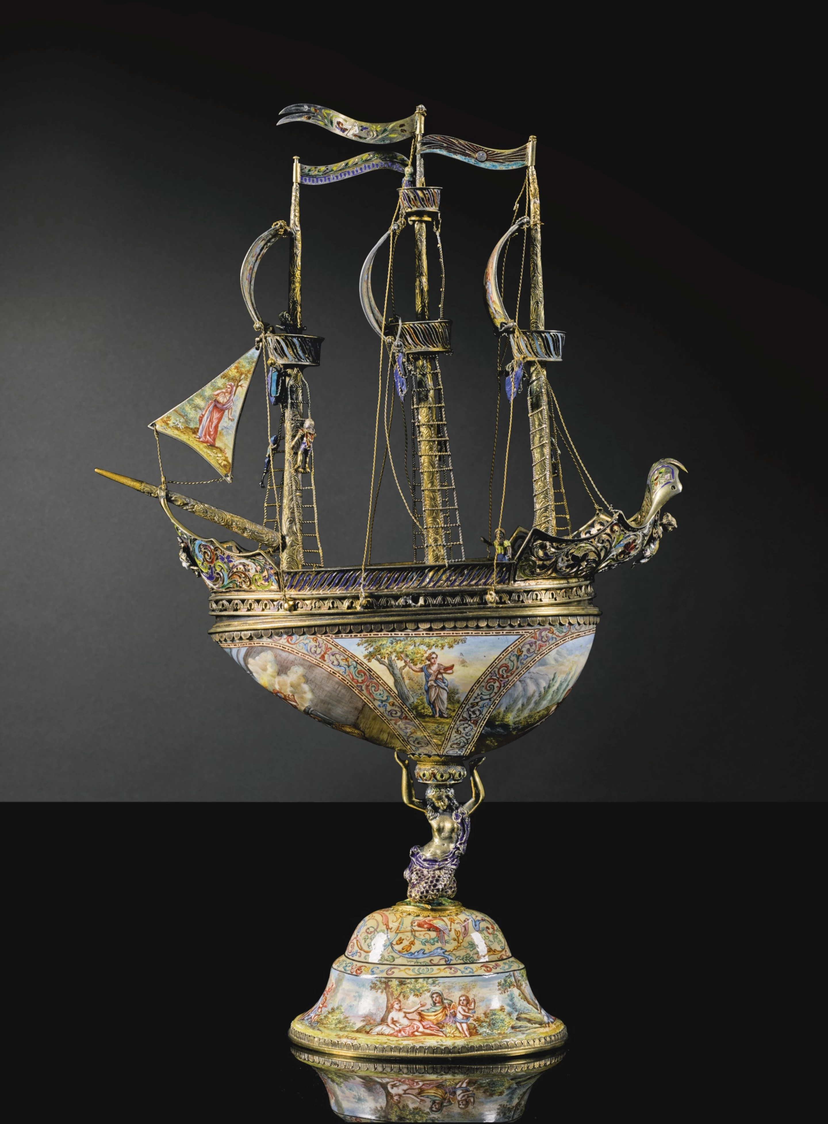 A silver-gilt and painted enamel nef, Leopold Weininger, Vienna, circa 1890