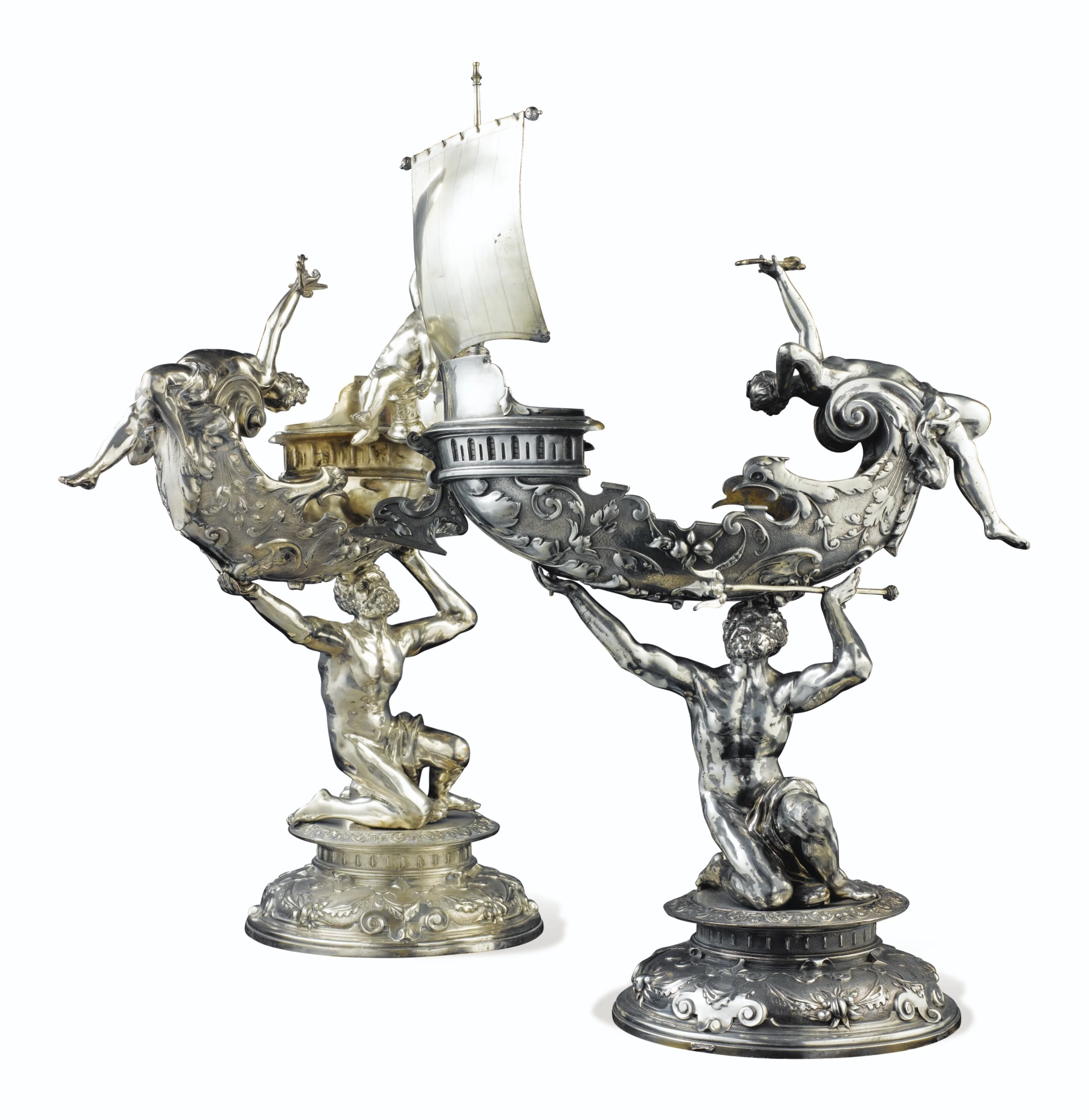 A GERMAN PARCEL-GILT SILVER AND GEM-SET CENTREPIECE FORMED AS A NEF
