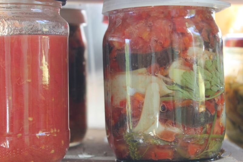 В чисто вымытые банки укладываем слоями все овощи в произвольном порядке, переслаивая их томатно-перечно-чесночной пастой