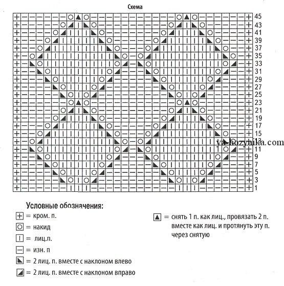 На схеме все ряды,четные и нечетные. 2 накида подряд вяжутся обвивами вокруг спицы. 2 раза спицу обовьете ниткой и будут 2 накида. в четных их провязывать лиц. и изн. меня смущает 2лиц вместе в 8 ряду. но решила,что это опечатка,т.к. они сбивают весь рисунок. вяжу просто снимая изн. с накидом. пока получается как на картинке) связала см 25, выкройки здесь нет, это скорее пончо с рукавами. Помоему вяжется сплошным полотном до горловины, манжет уже отдельно набирается. Довяжу рисунок,потом посмотрю насколько рукав будет широким. может придется вязать укороченными рядами,но на картинке вижу что полотно ровное. Буду рада,если кто-то еще напишет свои соображения по поводу вязания такого классного пуловера