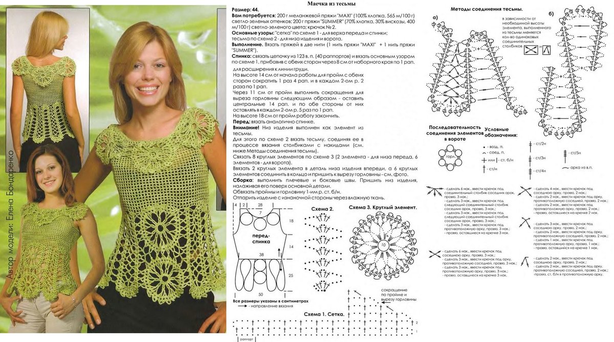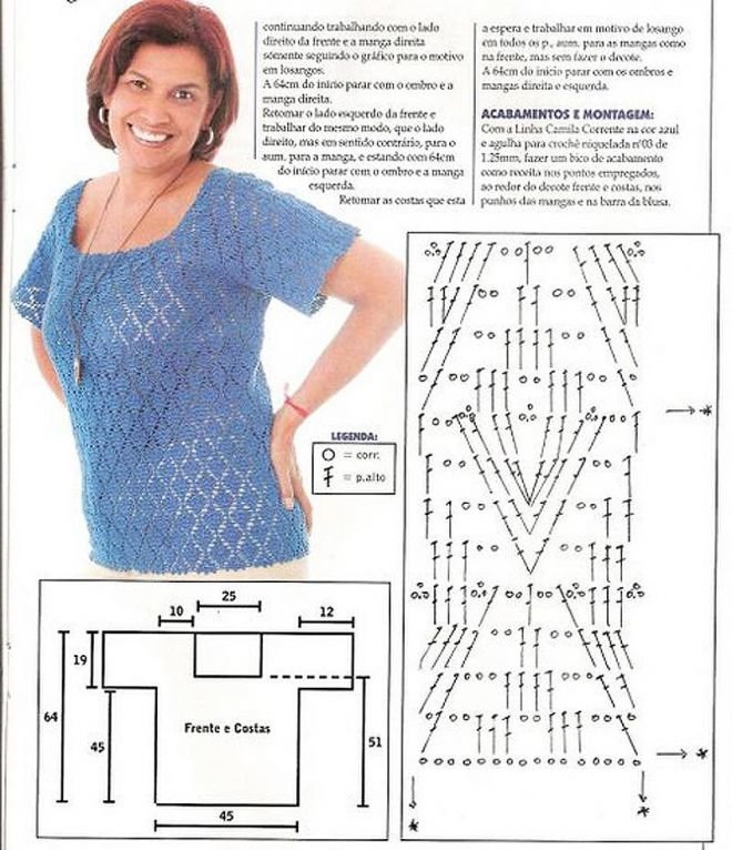 Данная модель вяжется по направления снизу вверх по кругу до пройм, согласно схеме, затем отдельно вяжется перед изделия и спинка.