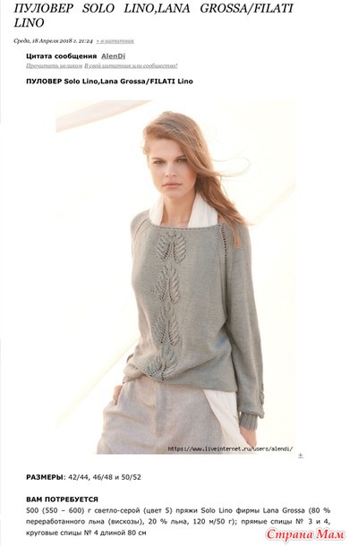 Связался у меня пуловер SOLO LINO, журнал FILATI.