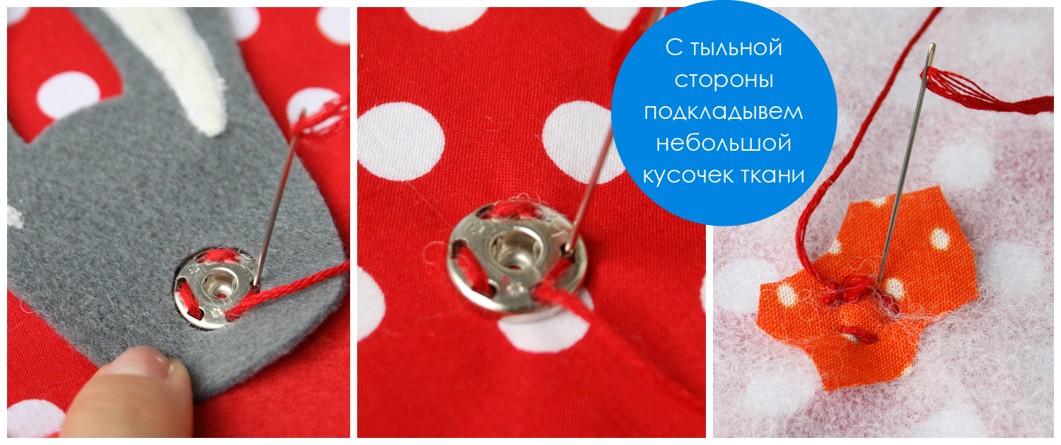 С тыльной стороны пришиваю через кусок ткани. Из опыта: без этого - синтепон тянется за ниткой на лицевую сторону :(