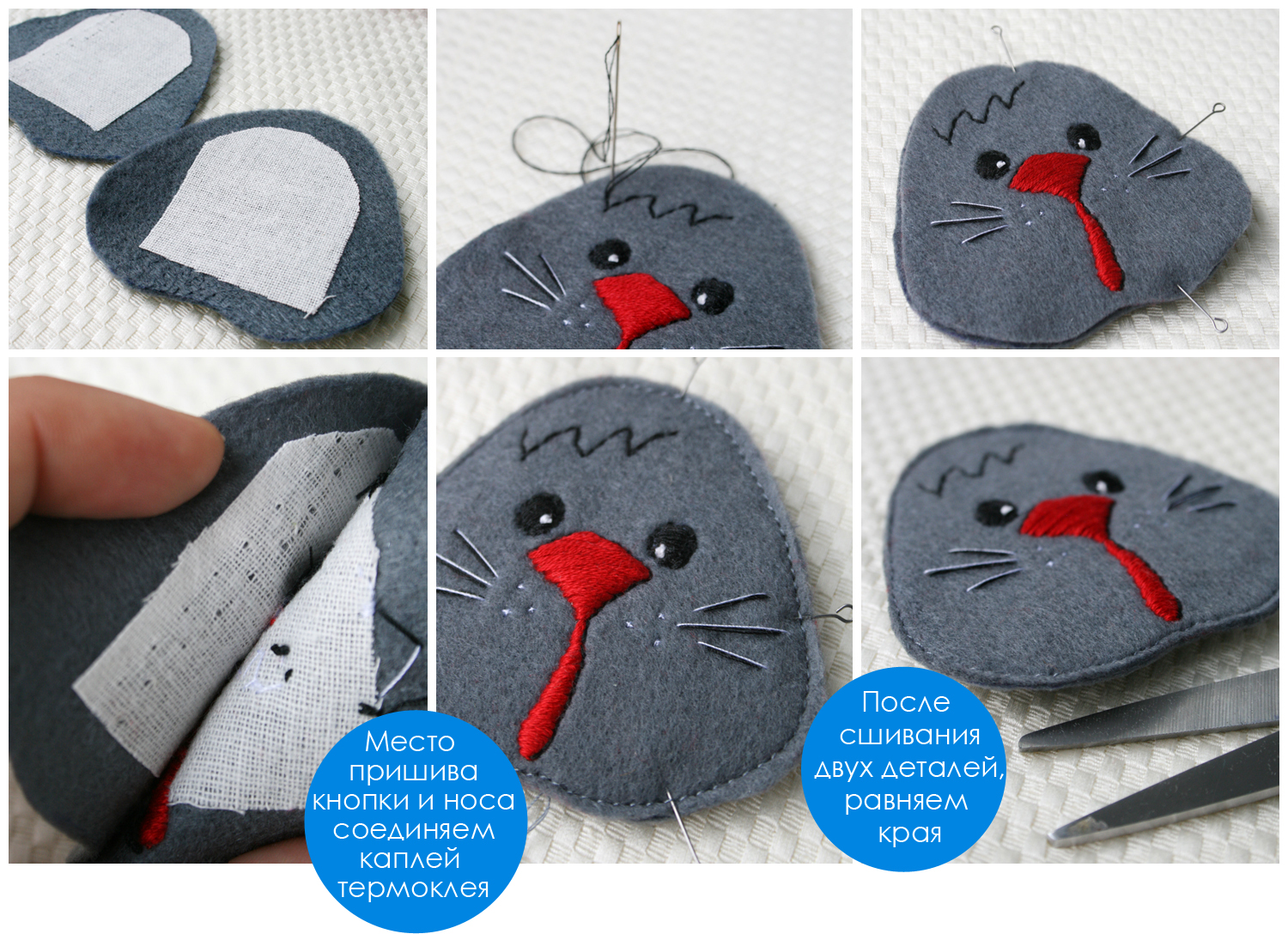 Фетр приятный в работе, и все же он тянется. Уплотняю центральные части деталей головы (где будет вышивка и место крепления кнопки) клеевым дублерином. На мордахе вышивка гладью.)