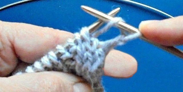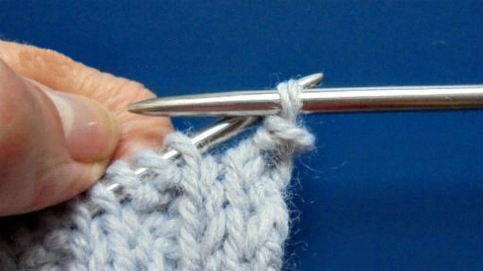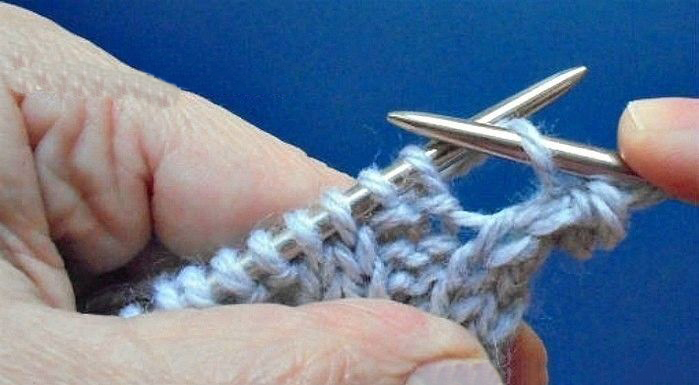 Снова вводим левую спицу в первую петлю на правой спице и правой спицей протягиваем через неё вторую петлю.