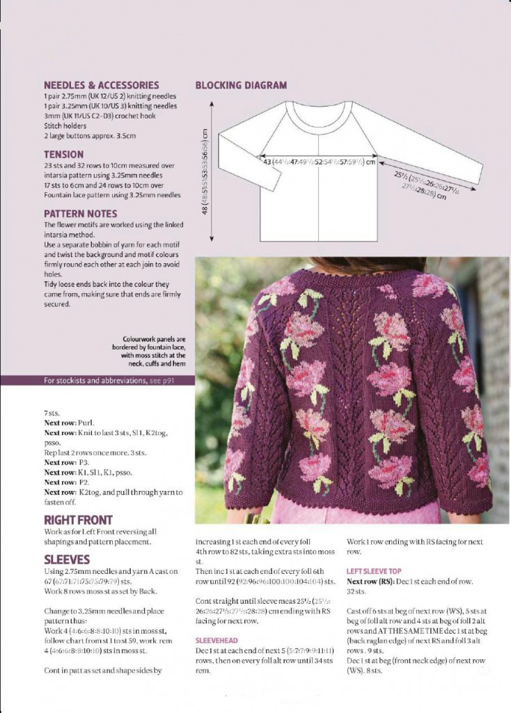 Чтобы связать жакет потребуется: пряжа Rown Milk Cotton (70% хлопок, 30% молочный протеин; 113 м/50 г) — 6 (6, 7, 7, 8, 8, 9, 9) мотков основного лилового цвета А, по 1 мотку темно-зеленого В, светло-зеленого C, ярко-розового D и красного E; пряжа Rowan Purelife Revive (36% шелк, 36% хлопок, 28% вискоза; 125 м/50 г) — по 1 мотку светло-розового F и темно-сиреневого G; спицы 2.75 мм и 3.25 мм; крючок 3 мм; 2 большие красивые пуговицы 3.5 см в диаметре.