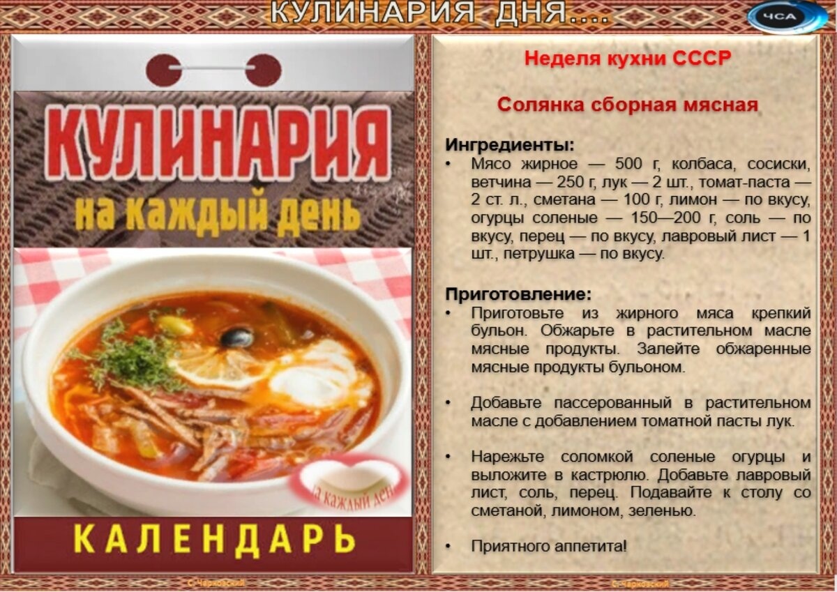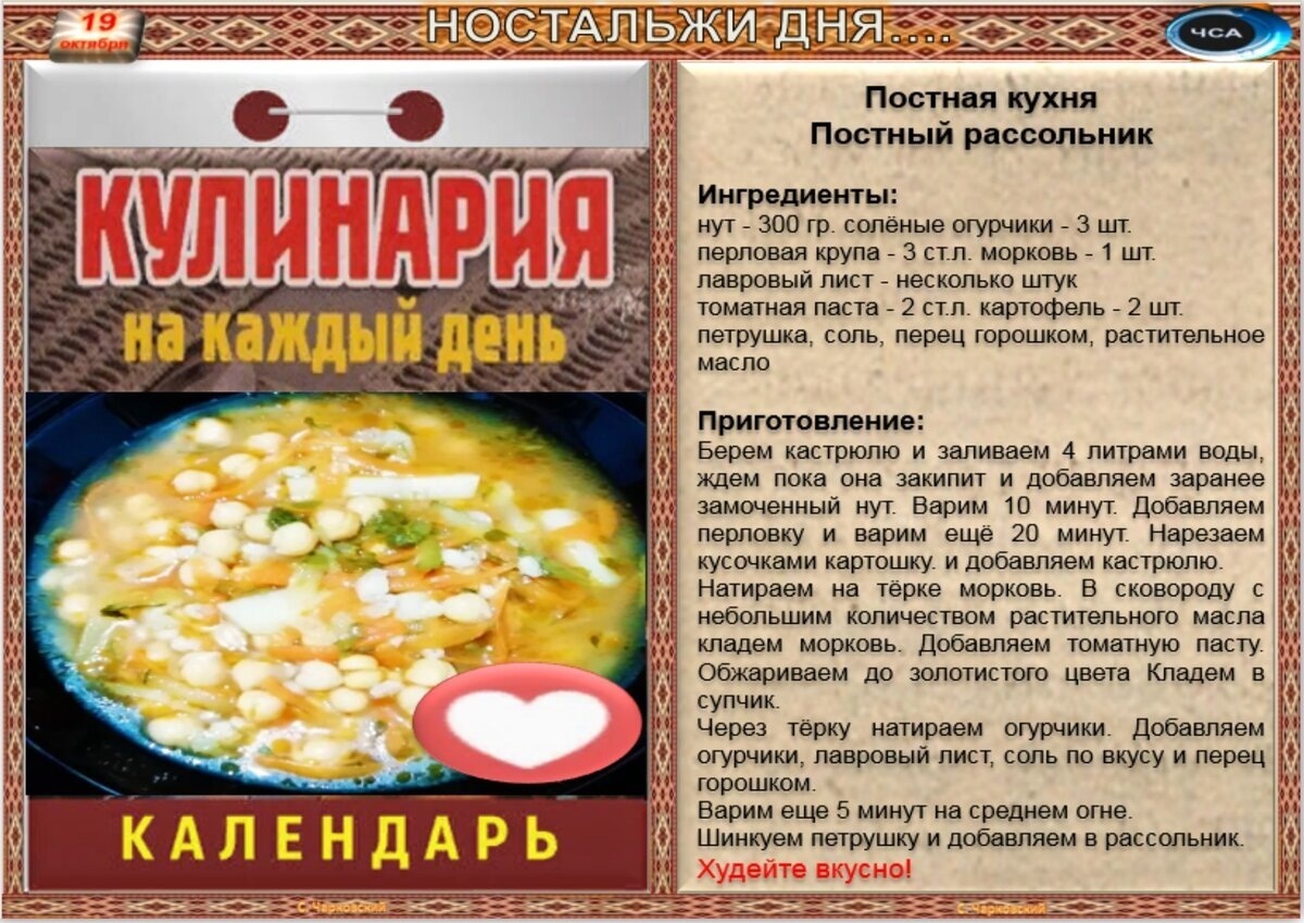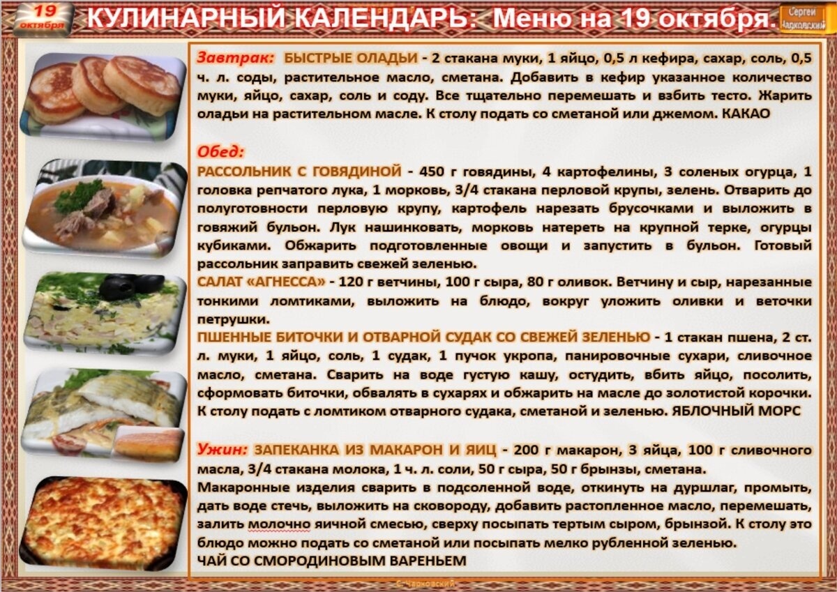Рецепты дня на 19 октября(авт.С.Чарковский)