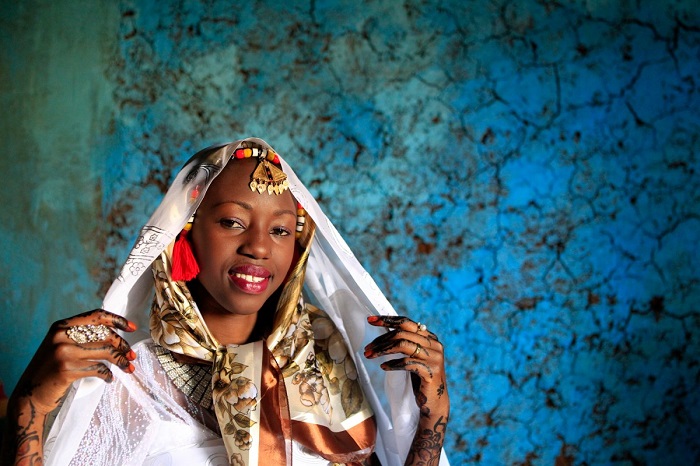 В Нубии невесте одевают цветной платок на голову, прозрачную вуаль на лицо и ещё белую фату, покрывающую голову.