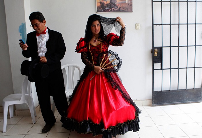Перуанскую невесту наряжают в красно-чёрные платья с многослойными хлопковыми юбками и декорированным подолом.