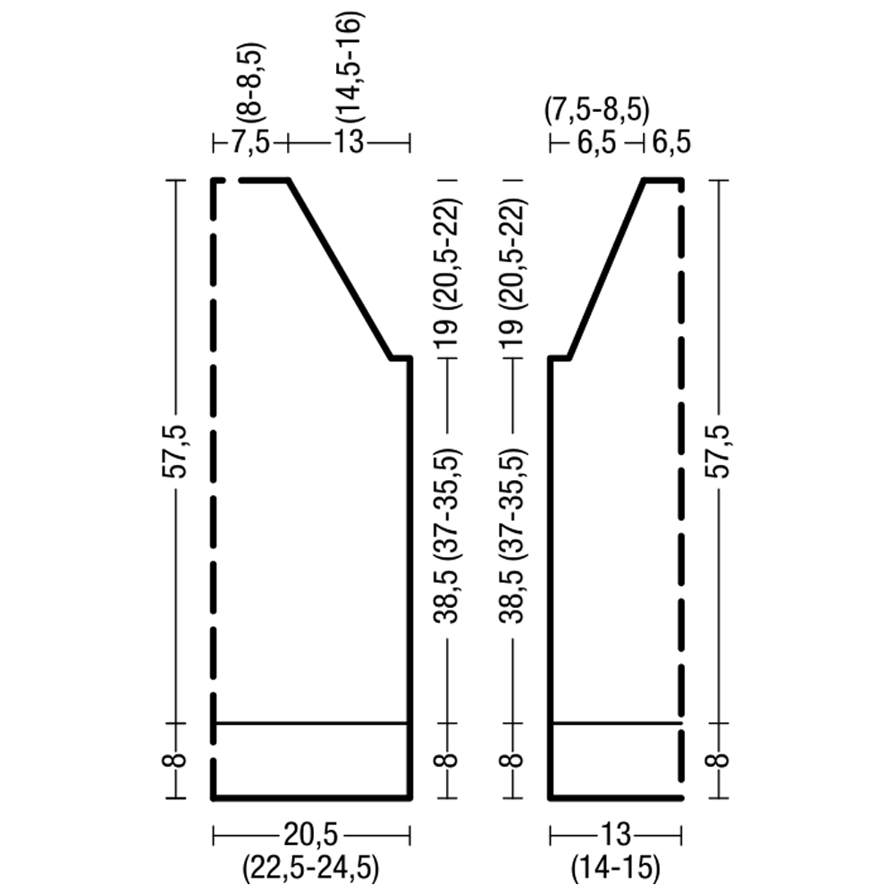 Через 38,5 (37-35,5) см = 100 (96-92) р. от смены узора закрыть для пройм с обеих сторон 3 (4-5) п. = 50 (52-54) п.