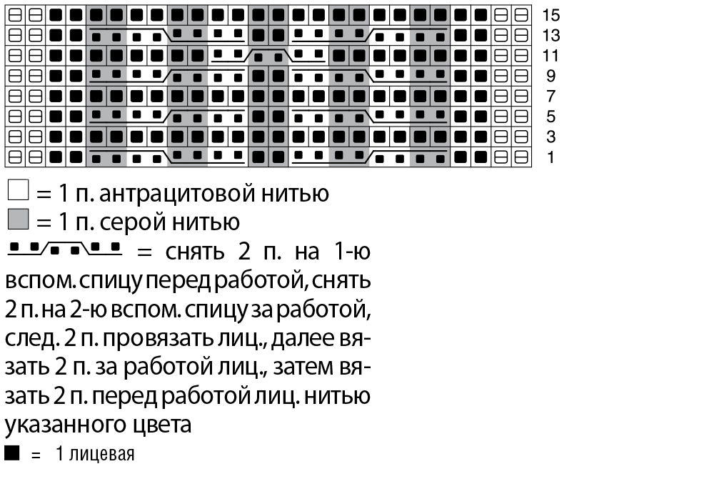 Лиц. р.: вязать попеременно в технике жаккарда, 2 п. лиц. глади серой нитью, 2 п. изн. глади антрацитовой нитью. Изн. р.: 2 п. лиц. глади антрацитовой, 2 п. изн. глади серой нитью.