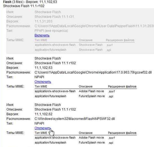 Здесь можно определить версию установленного плагина, а так же путь к каталогу, в котором он установлен. Встроенные в Google Chrome плагины те, в которых упоминается Chrome. Если же путь к каталогу начинается со строчки C:\Windows\system32, это версии Flash для других браузеров. Если требуется деактивировать, нажмите кнопку "Отключить" под его названием.