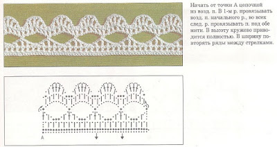 Схемы каймы для отделки пальто подобраны таким образом, чтобы сразу вывязывалась петля для пуговицы.