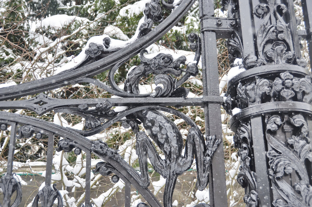 Конечно же, прежде чем начать рассказ о владельцах этой дачи, стоит сказать несколько слов о великолепной кованой ограде с воротами, за которыми прячется исторический особняк. Решетка украшена не только растительным орнаментом и инициалами первой владелицы этой дачи графини Марии Клейнмихель, но и саламандрами.