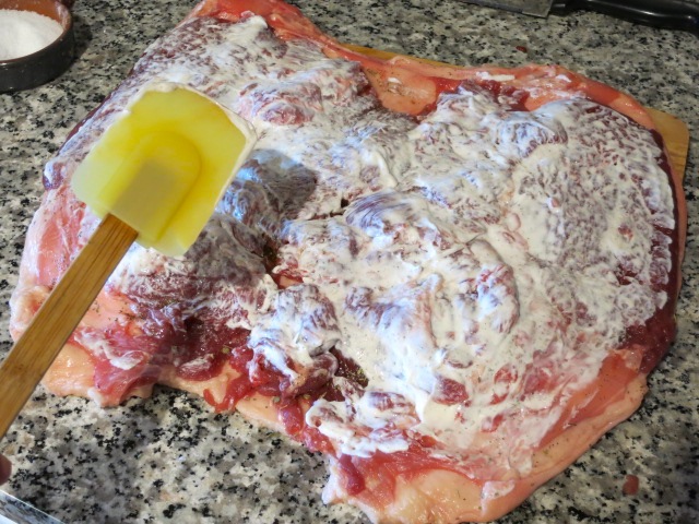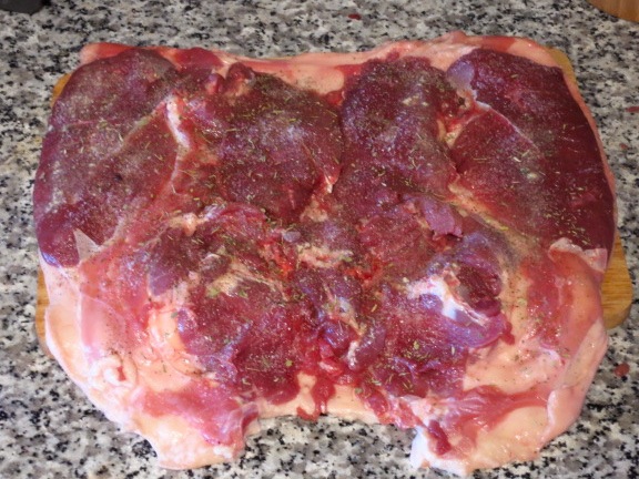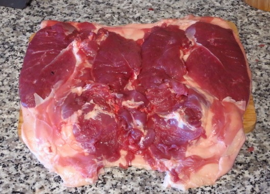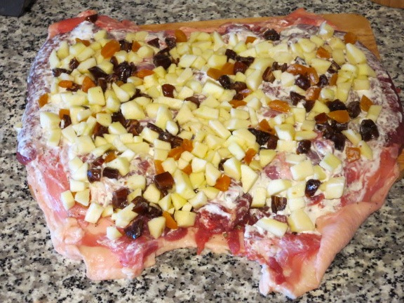 Распределяем начинку на распластанной тушке. Края тушки (примерно по 3 см со всех сторон) оставляем свободными.