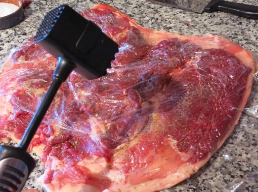 Накрываем пласт мяса пластиковой пленкой; отбиваем его молотком для мяса.