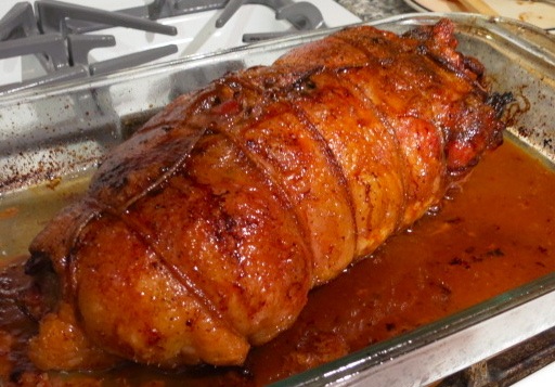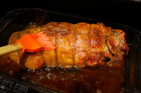 Во второй половине запекания иногда поливаем рулет соками со дна формы. При пробе ножом из готового рулета должен течь прозрачный сок. Температура внутри готового рулета - 72 С (160 F).