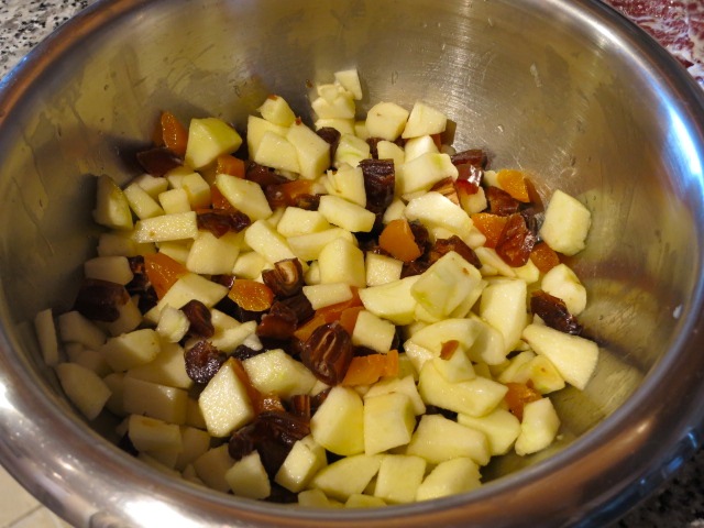 Поливаем яблоки и сухофрукты коньяком, перемешиваем.
