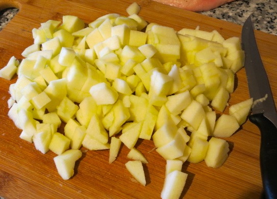 Готовим начинку. Яблоки очищаем, удаляем из них серединки. Нарезаем яблоки мелкими кубиками.