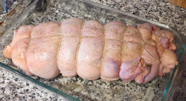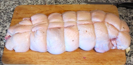 Кладем рулет "швом" вверх и плотно перевязываем бечевкой по принципу "ветчины в магазине."