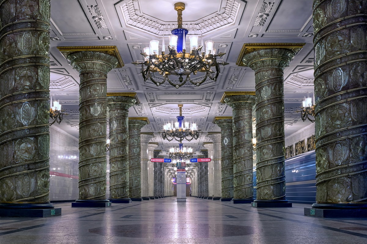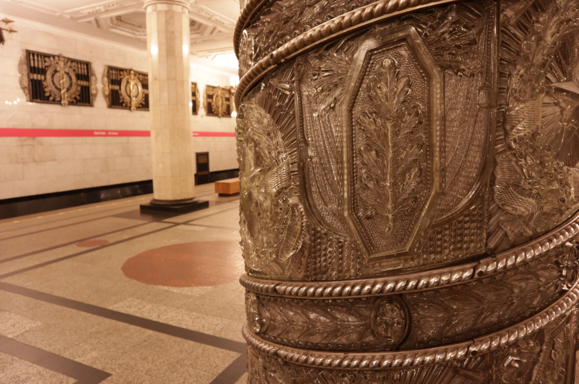 Явно не мрамором, гранитом и чугунным литьём, которых в любом российском метрополитене полно. Автово известно на весь мир своими 16-ю колоннами.