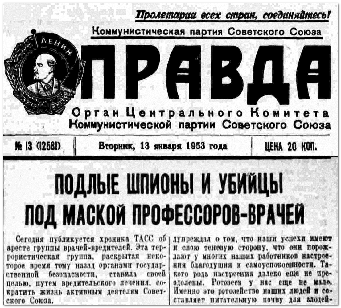 Итак, речь пойдет о нашумевшем в 1953 году, а еще больше перед развалом СССР и в девяностые, так называемом "деле врачей", вспомнить суть которого или узнать, если вы впервые слышите, можно, так сказать, в первоисточнике.