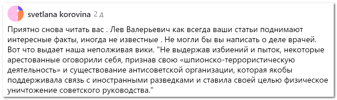 💬 ..."какую роль играли в смерти Жданова врачи? Я думаю, что ни у кого из вас, после прочтения статьи, не будет сомнения в том, что эти люди совершили, как минимум, сразу два преступления"...
