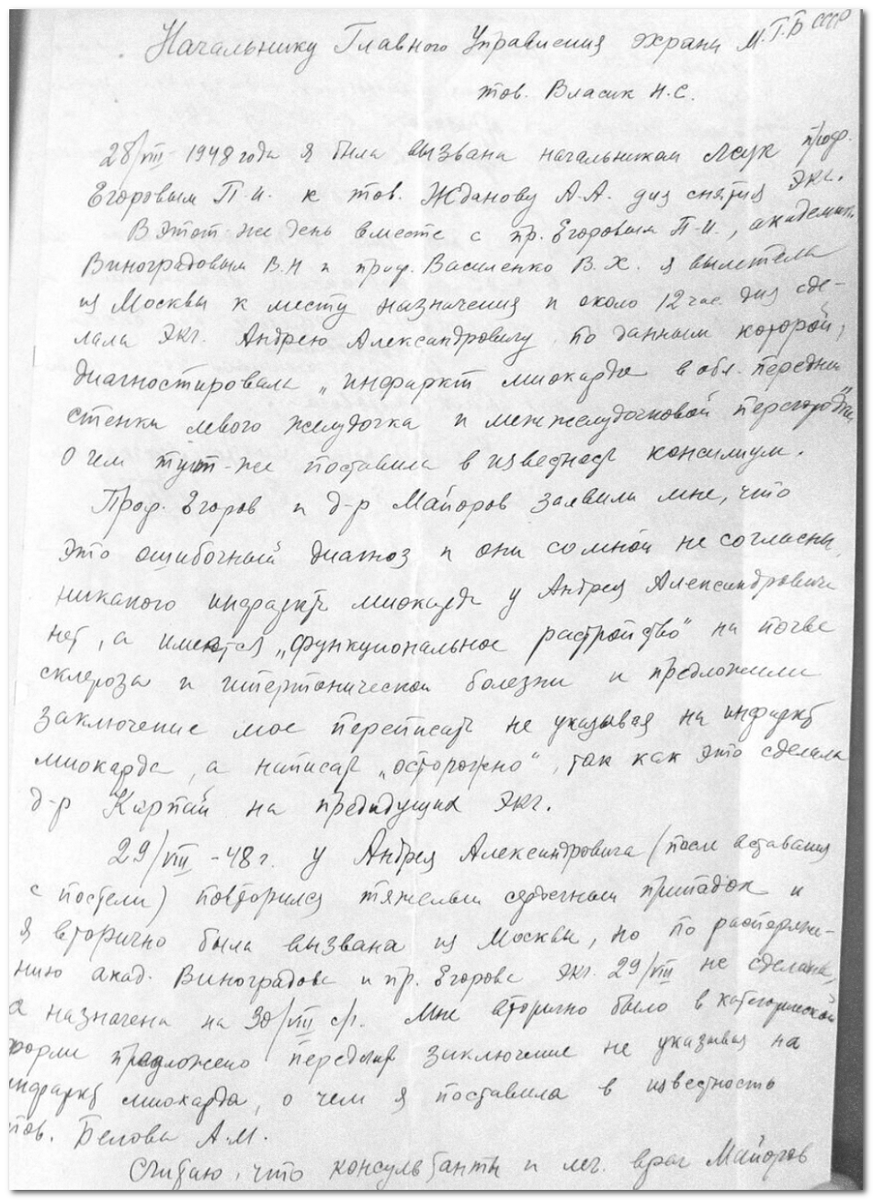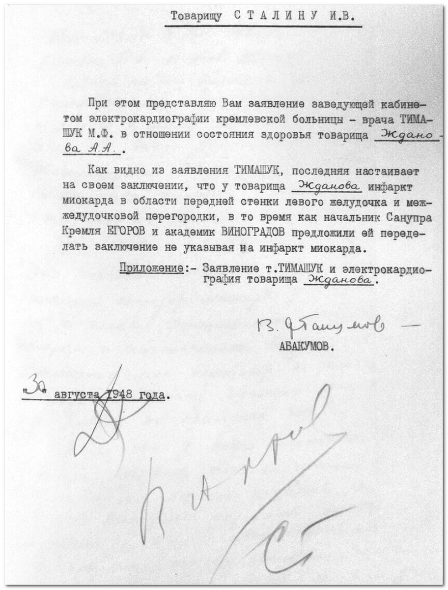 Разоблачительное письмо кардиолог написала 29 августа 1948 года, как вы понимаете задолго то того, как Жданов умер. Это произойдет через двое суток после того, как это письмо прочитает Власик.