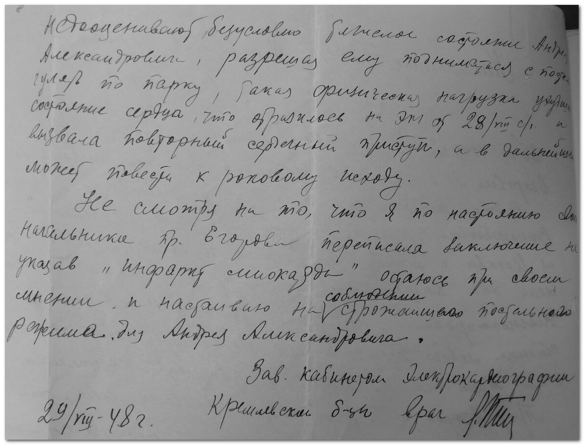 Но Иосиф Виссарионович не придал записке особого значения, посчитав ее кляузой на врачей. Тем более, что 30 августа 1948 года Жданов был еще жив, возможно даже общался со Сталиным, рассказывал о самочуствии.